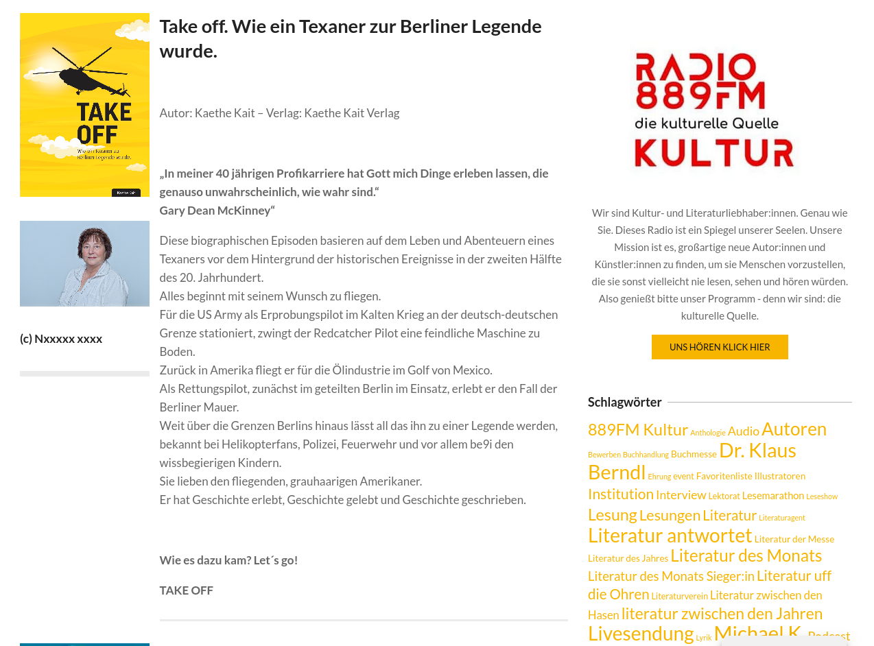 Im Ruhestand hat es mich zurück in die Region an die schöne Havel gezogen. Hier in Brandenburg konnte ich mich von meiner Passion, den Texten nicht lösen und schreibe nun selbst. TAKE OFF ist mein Debüt.